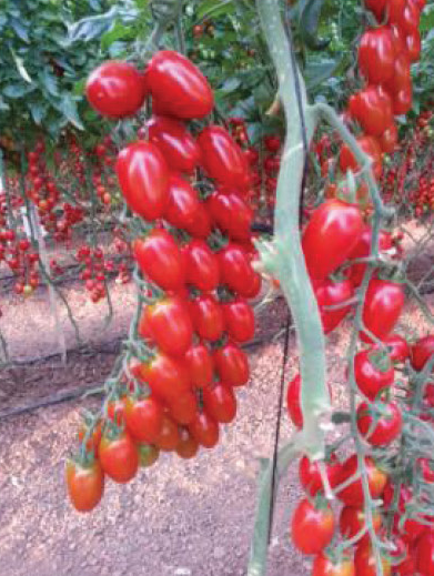 Type: indeterminate. Early-medium maturity, very productive plants. Its flesh is juicy with an excellent sweet taste. Very good shelf life. Fruit weight: 15-20 gr. Fruit shape & color: Oblong ° grape, uniform, brilliant red, green shoulder. Resistances: TYLCV, TMV.